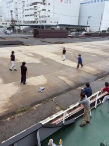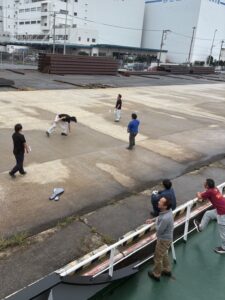 船橋の仮バースでみんなでバトミントンをしている様子です😸👍